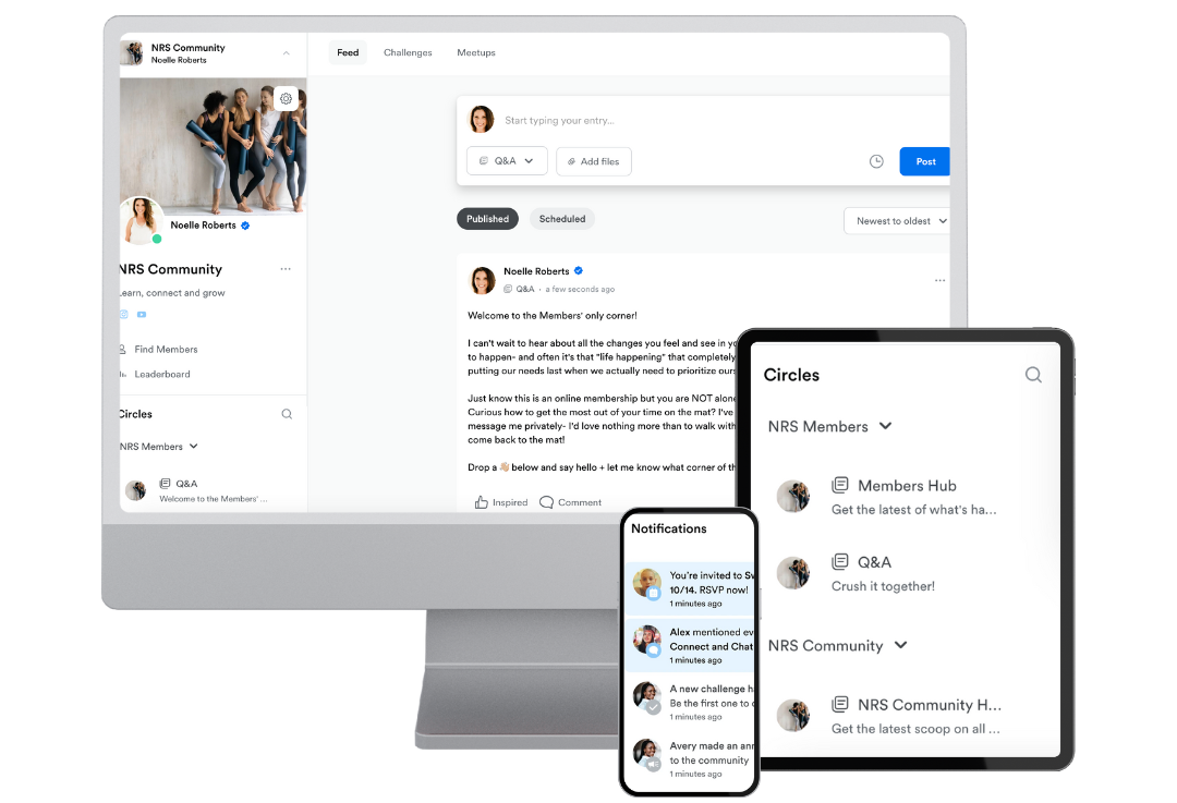 Online but never alone! Get your questions answered and guidance for your specific needs or limitations. Plus access to unique, members' only challenges, live events and encouragement inside the NRS community. I'll be there to walk with you as you discover daily transformation every time you come back to your mat.